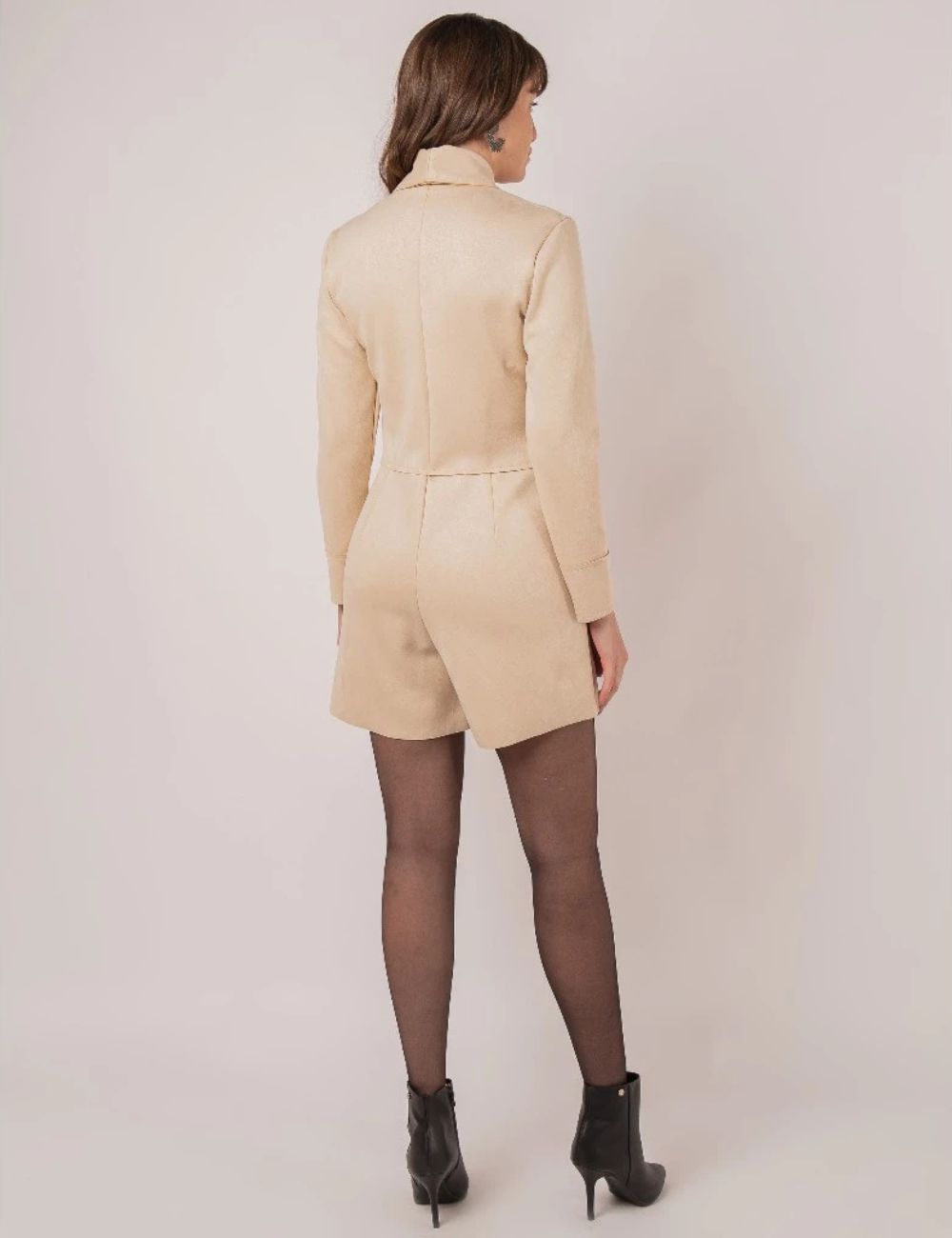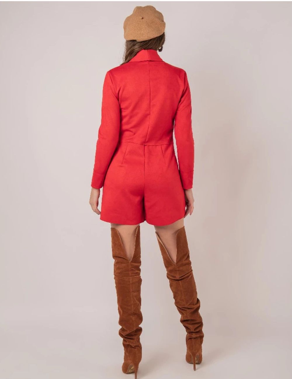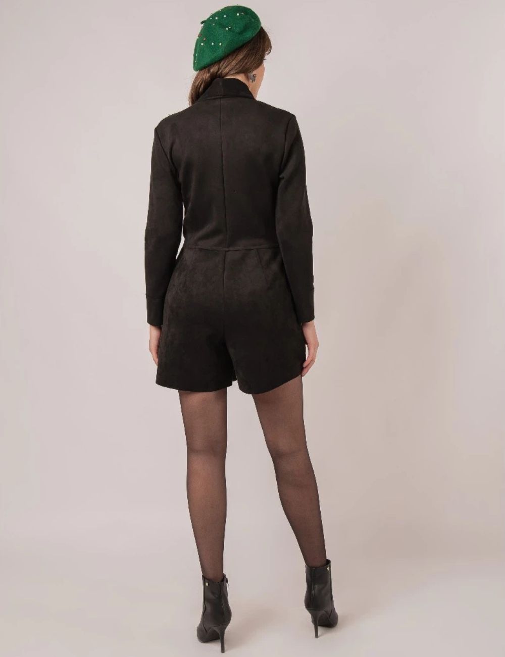 Este macaquinho de camurça estilo blazer traz elegância e conforto para o seu guarda-roupa. Com gola de lapela, mangas longas com punho e fechamento cruzado com botões e zíper, oferece um ajuste sofisticado e prático. A parte inferior com shorts reto e bolso de patch no lado esquerdo garante liberdade de movimento e estilo. Perfeito para dias mais frescos, combina modernidade e versatilidade, ideal para diversas ocasiões sem perder o charme.
